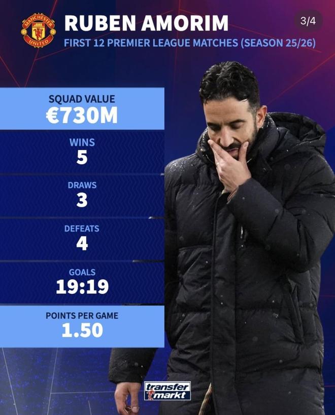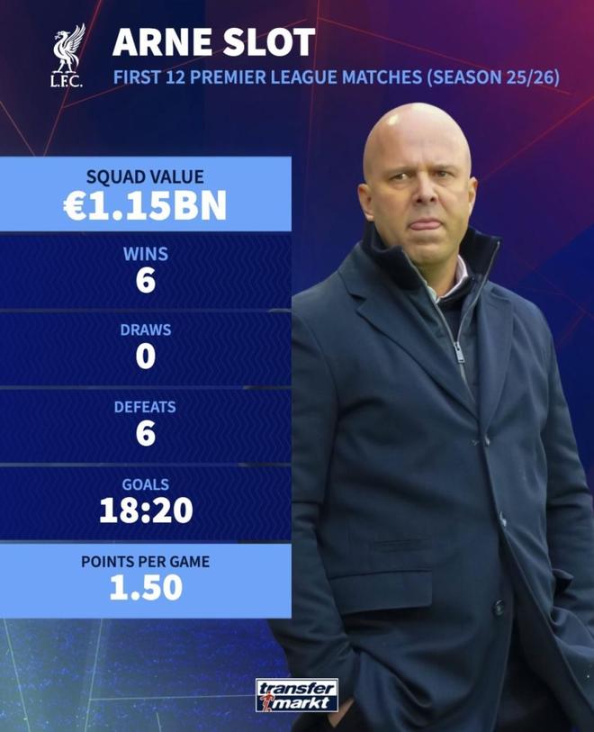 但放在这份榜单的语境下,这些理由很难完全说服人——利物浦是三队里阵容最贵的,结果6胜6负排第12,18进20失、净胜球为负,说明他在压迫高度、阵型紧凑度和中后场保护之间的取舍一直没理顺,高位逼抢一旦被对手打穿,整条防线就暴露在大空间里。就本赛季目前的内容来说,弗兰克算是稳,阿莫林算是一般,而身价最高却踢成这个防守质量和排名的斯洛特,执教表现确实是三人里最让人失望的那个。